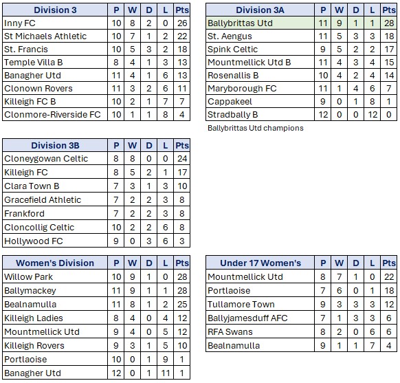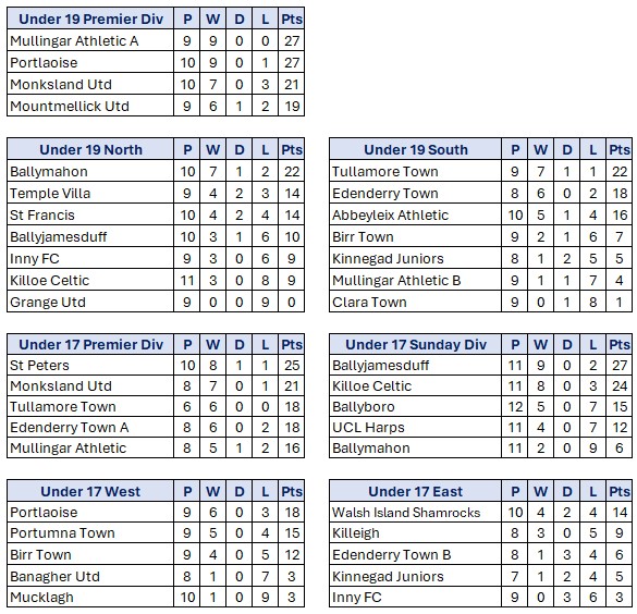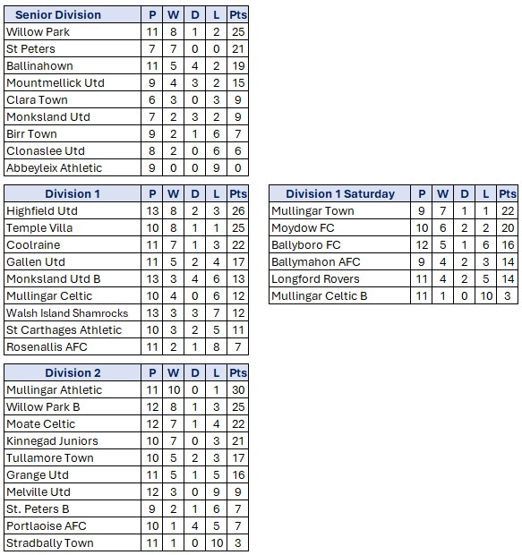 Combined Counties Football League Fixtures Week 17 Friday November 30th Senior Division Willow Park v Arlington; 8.00; Willow Park Athlone; P Nolan, I Stacey, K Ronan Saturday December 1st All games 2.30 unless stated Umbro FAI Youths Cup 2nd Round Boyne Rovers v Killavilla Utd; Time TBA, Drogheda; Local Edenderry Town […]