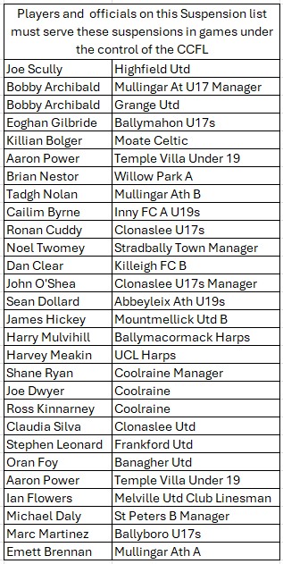 Combined Counties Football League Fixtures Week 29 Saturday 6th April All games 2.30pm unless stated Lambe Brothers CCFL Youths Cup Quarter Finals (Players born 2001 or later) Portlaoise v Abbeyleix Ath; Rossleighan Park Portlaoise; Offaly Willow Park 17’s v St Francis; Willow Park Athlone; Midlands Kinnegad Juniors v Mullingar Ath 17’s A; Lagan Park […]