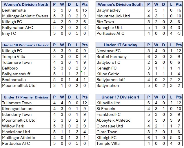 Friday November 1st Under 17 Women Bealnamulla v Real Swans; 7.30 Bealnamulla Athlone; Midlands Ballyjamesduff v Tullamore Town; 7.30; Castle Villa Kells; Midlands Division 2 Tullamore Town v Moate Celtic; 8.00; Leah Victoria Park Tullamore; Offaly Saturday November 2nd All games at 2.30 unless stated Under 17 East Inny FC v Edenderry Town A; parish […]